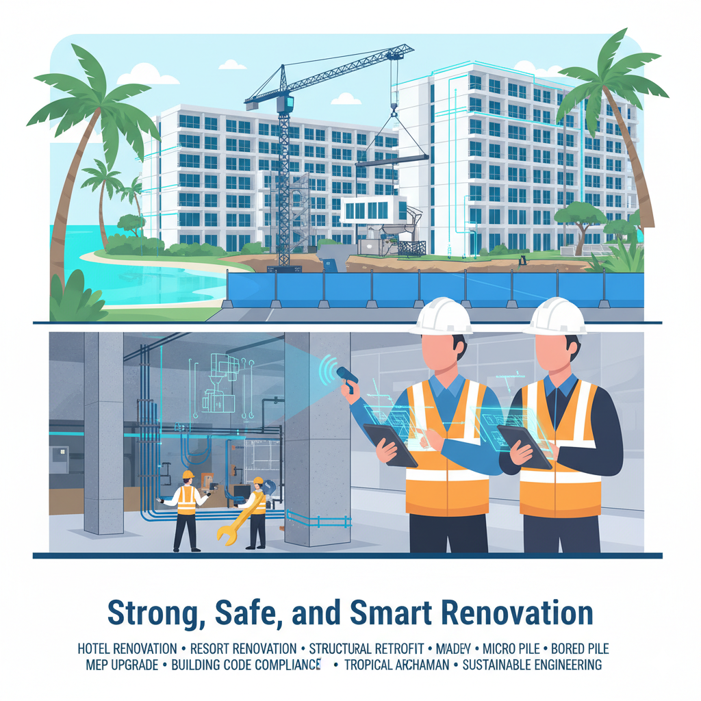 ผู้เชี่ยวชาญงานยกฐานราก–กําแพงกันดิน–รีโนเวทโรงแรมโดยไม่หยุดธุรกิจ คุมงบ–คุมเวลา–เอกสารพร้อมตรวจ ทีมวิศวกรขึ้นทะเบียนและ NDT ครบชุดในภูเก็ต–อันดามัน
